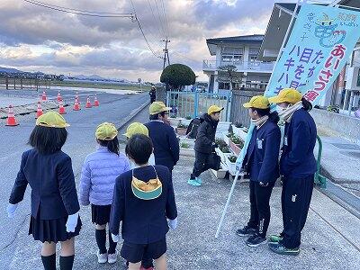 今週から児童会の取組で、朝のボランティアが始まりました。曜日ごと学年別に参加し、6年生と一緒に活動します。今日は2年生がたくさん出てきて、あいさつ運動をがんばってくれました。