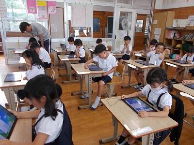 たぶれっとに もじをかくことが はじめての 1ねんせいにっこり「どうやるんですか~?」のコールが ひびきわたっていましたニヒヒ!!