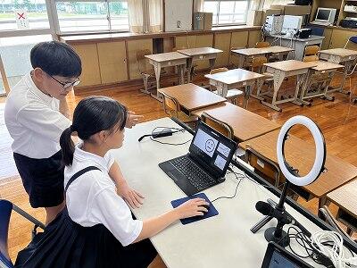 ICTの活用は委員会活動でも日常となっています。コロナで休校中のオンラインの活用を経て、本校ではいろいろな連絡やお知らせ、集会などにオンラインの放送を使用しています。写真の最初は運営委員会が自分たちでスライドを作り、それを使ってオンラインの放送をしている様子です。また放送委員会ではインタビューをビデオで撮影し、それを放送しようと先生と相談しながら編集作業を進めています。
