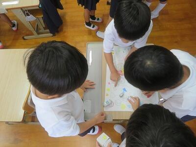 「いろいた」をつかって、ペアで きょうりょくしながら かたつをつくっています