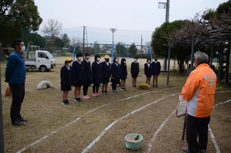 2月26日、6年生と5年生が立派な藤の花が咲くように、藤の幹を中心に放射状に穴を開け、肥料を与えました。施肥の仕方や理由を川上さんに教えていただき、実際に道具を使って肥料を与えました。