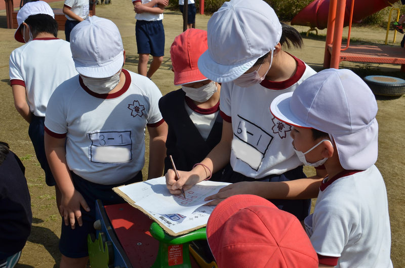 お別れ遠足は近くの龍峯やまびこ公園まで歩いていき、5年生が企画した全員参加のレクリエーションや縦割り班の謎解きゲームを楽しみ、最後のふれあいを惜しんでいました。