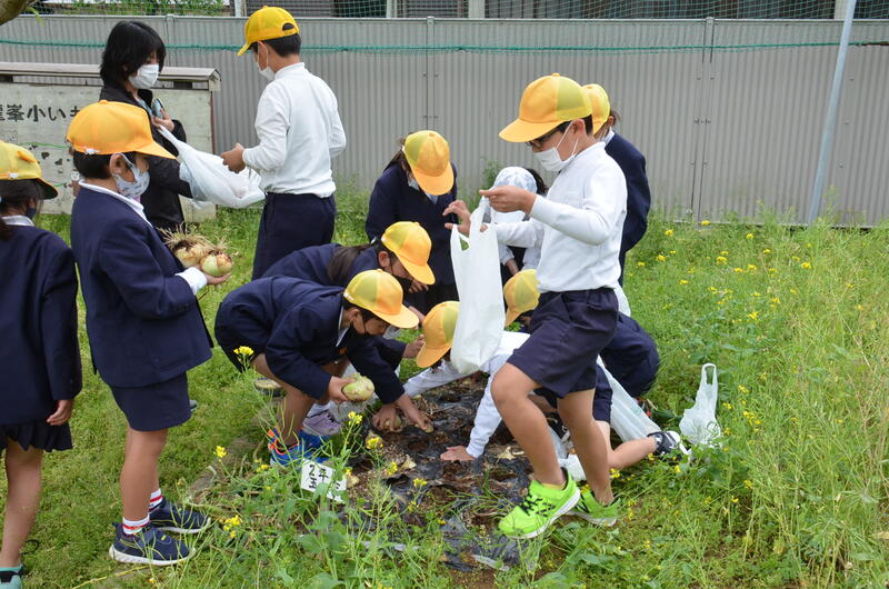 理科の授業に先立ち、昨年植えつけた玉ねぎの収穫もしました。子供たちは立派に育った新玉ねぎを手で引き抜き、収穫の喜びを感じていました。その後、教室に持ち帰ったのですが、理科の授業は玉ねぎの香りで満たされていました。