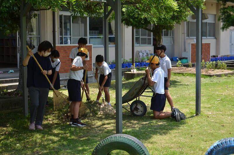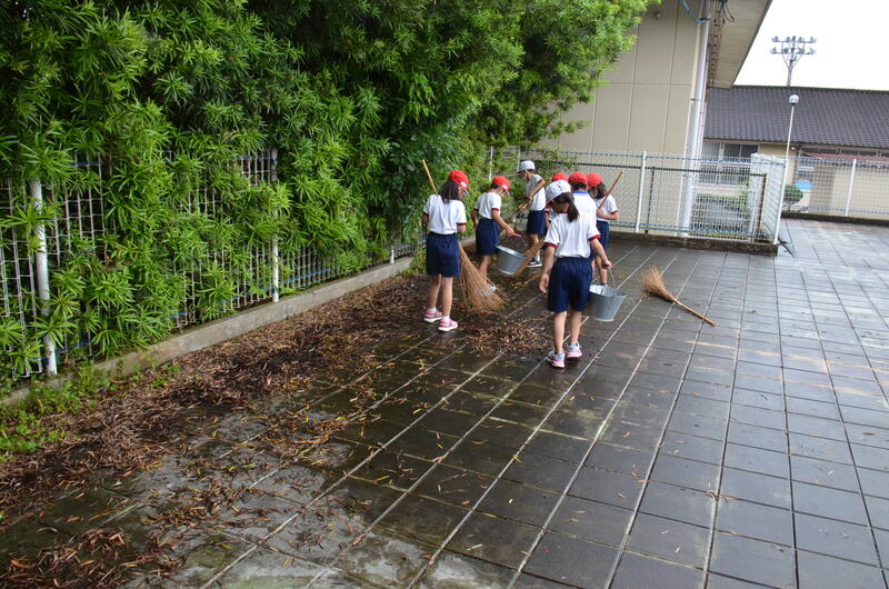 6年生が九一マラソンの後に、運動場に茂り出した草を引くボランティア活動を始めました。朝のランニングの後、委員会や係の仕事をすませ、それぞれに道具を持って集まり、草引きをしています。