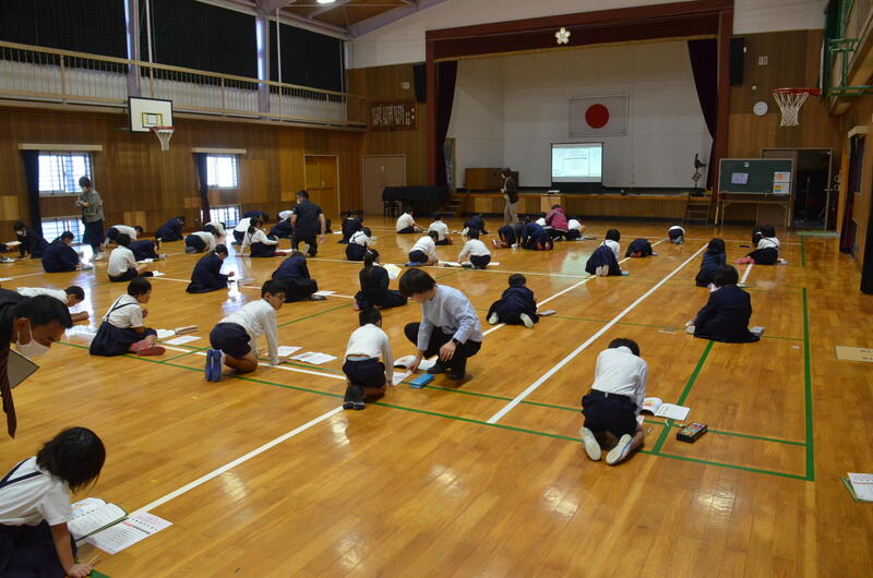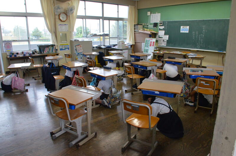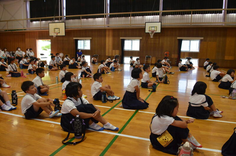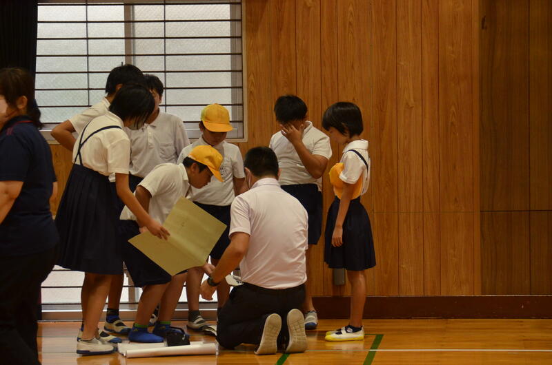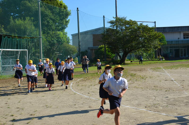子供たちは「3つの安全確保行動(シェイクアウト訓練)」を確かめたり、マイタイムラインの大切さを学んだりしたあと、地震が起きたことを想定して、運動場への立ち退き避難(水平避難)と土砂災害に備え校舎3階に避難する(垂直避難)の訓練をしました。子供たち一人一人がもし地震が起きたならばを考え、真剣に訓練に参加していました。