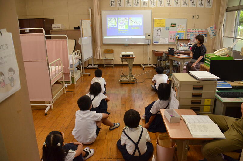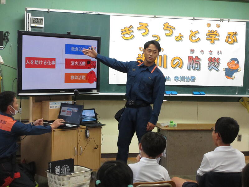 氷川分署の隊員の皆さんには、毎回それぞれの学年に応じた内容を、映像等を交えてお話しいただきますので、大変分かりやすく、子供たちもワクワクしながら聴くことができています。また、卒業生も紹介していただき、供たちにとってはキャリア教育の一助にもなりました。