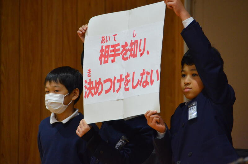 それぞれの学年が人権学習で学んだことから、いじめや差別・偏見をなくすために大切にしたいことを考えて発表しました。各学年の発表は次の教材から学んだことを発表していました