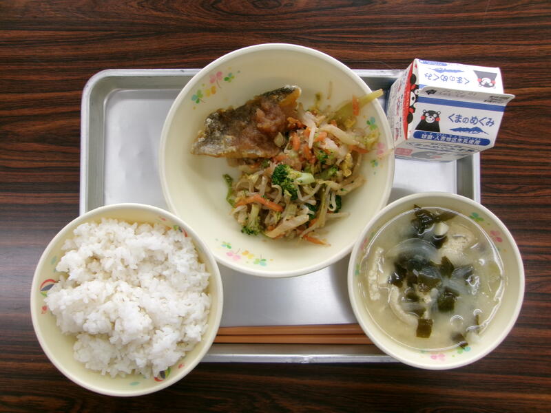 今日の献立は、麦ごはん、タラのみぞれソース、ブロッコリーのごまあえ、豆腐のみそ汁、牛乳でした。