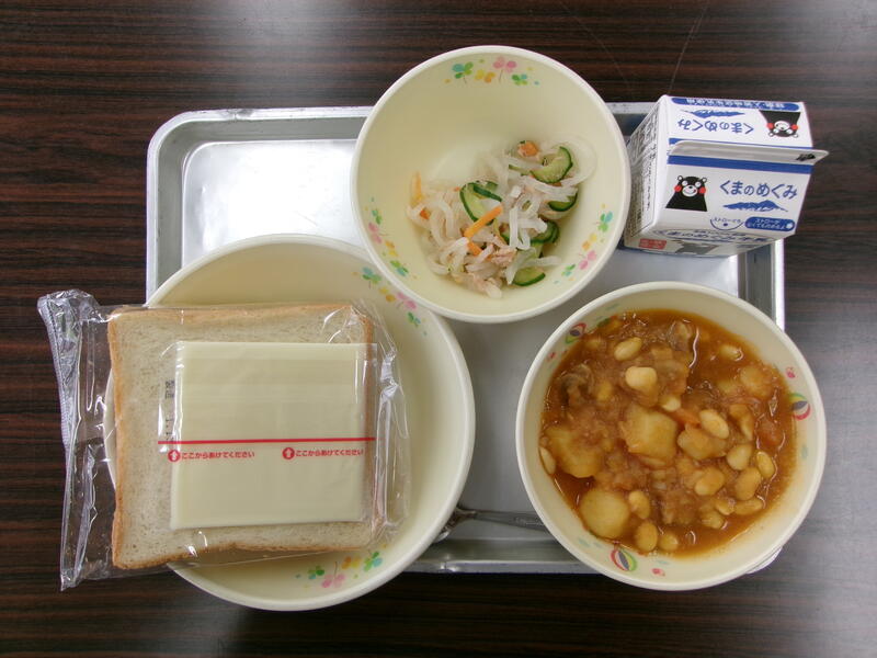今日の献立は、食パン、一食スライスチーズ、大根ツナサラダ、ポークビーンズ、牛乳でした。