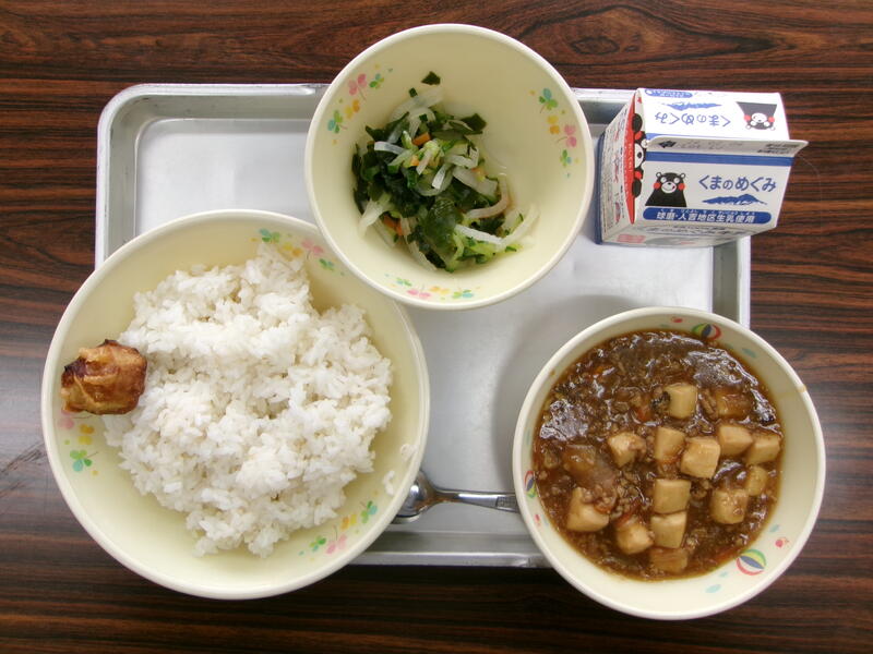 今日の献立は、麦ごはん、揚げシューマイ、大根の中華あえ、マーボー豆腐、牛乳でした。