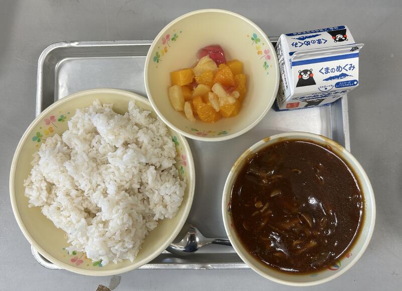 今日の献立は、ハヤシライス、フルーツジュレ、牛乳でした。