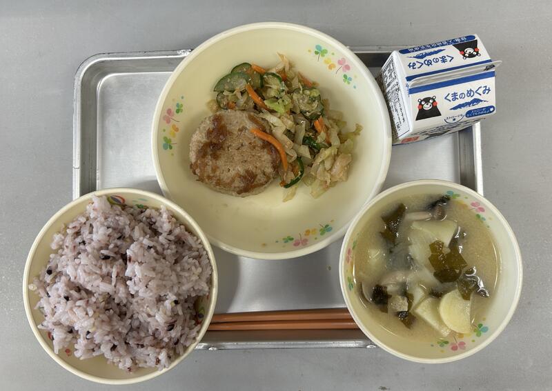 今日の献立は、雑穀ごはん、豆腐ハンバーグの和風ソース、じゃがいものみそ汁、ごまあえ、牛乳でした。