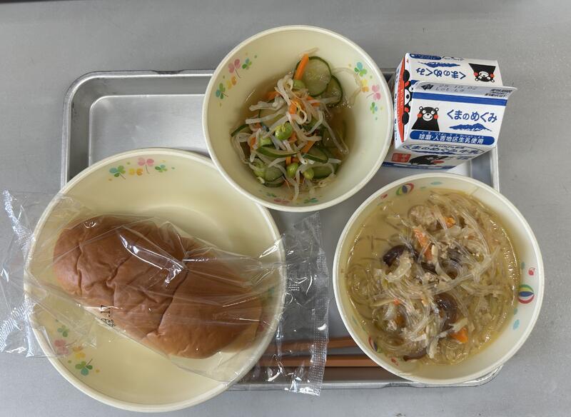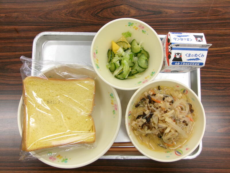 今日の献立は、ミルクパン、春雨のタンタン麺、中華サラダ、牛乳でした。