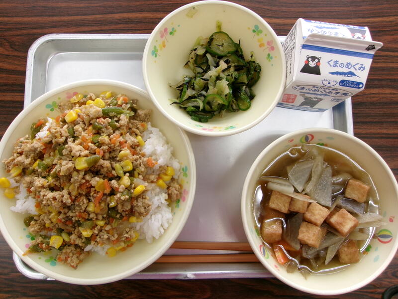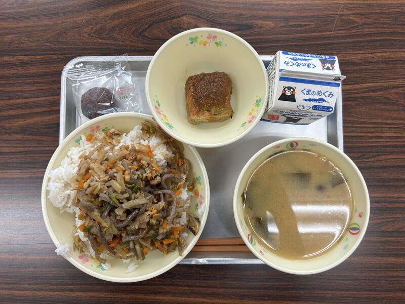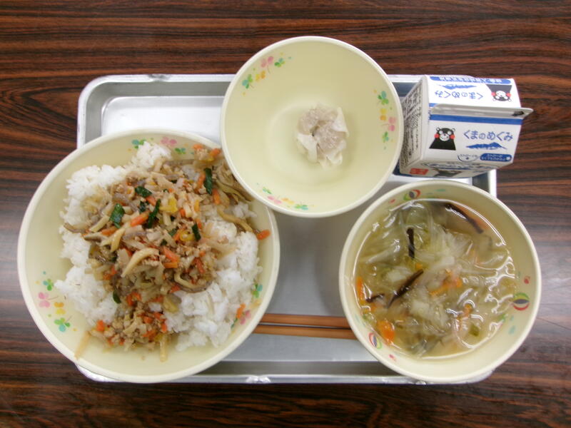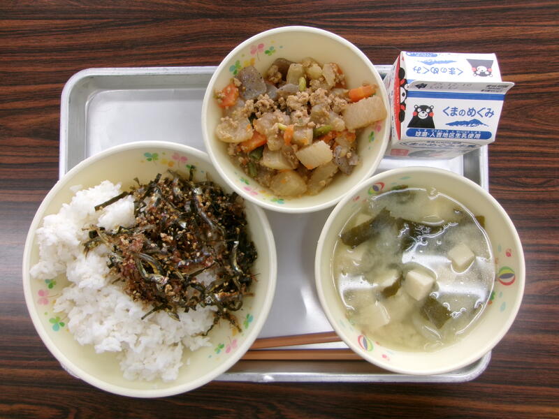 今日の献立は、セルフそぼろごはん、しそひじきあえ、たぬき汁、牛乳でした。