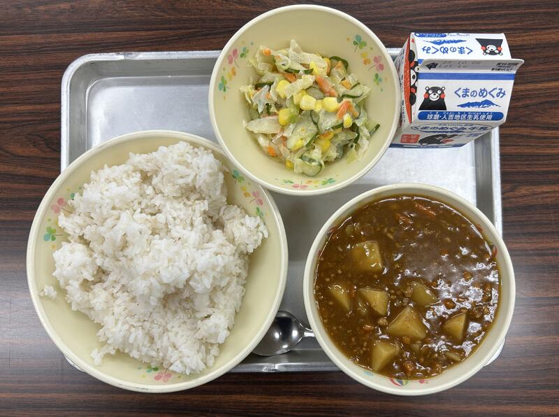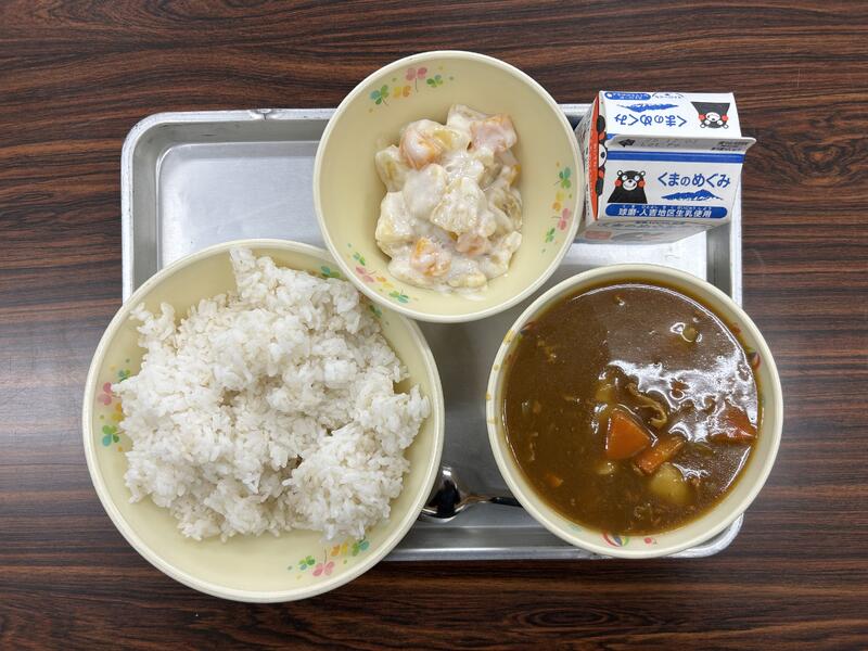 今日の献立は、麦ごはん、カレー、ヨーグルトあえ、牛乳でした。