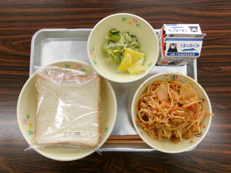 今日の献立は、食パン、スパゲティナポリタン、生パインサラダ、牛乳でした。