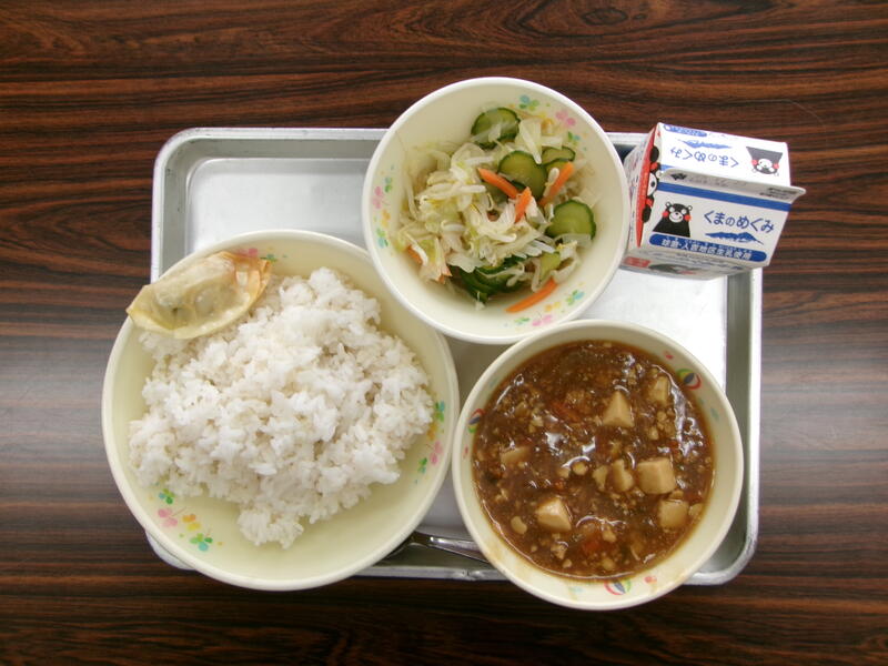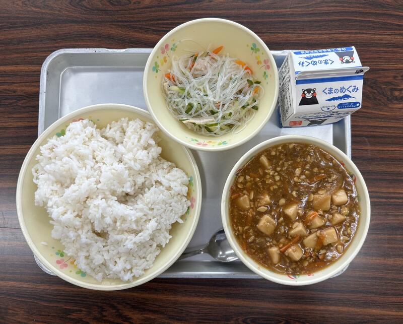 今日の献立は、麦ごはん、マーボー豆腐、バンサンスー、牛乳でした。