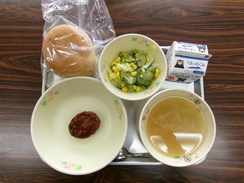 今日の献立は、バーガーパン、ハンバーグのカクテルソース、オニオンスープ、グリーンサラダ、牛乳でした。