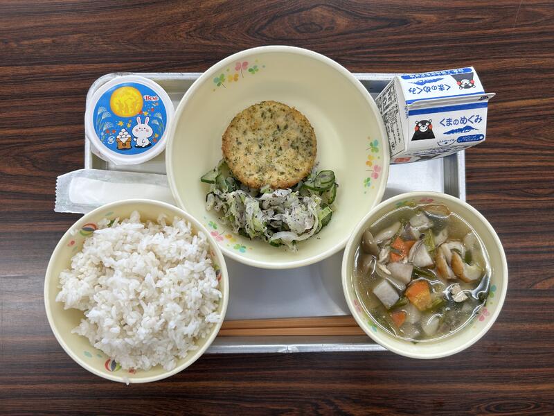 今日の献立は、麦ごはん、大豆と豆腐のフライ、しそあえ、月見汁、お月見デザート、牛乳でした。