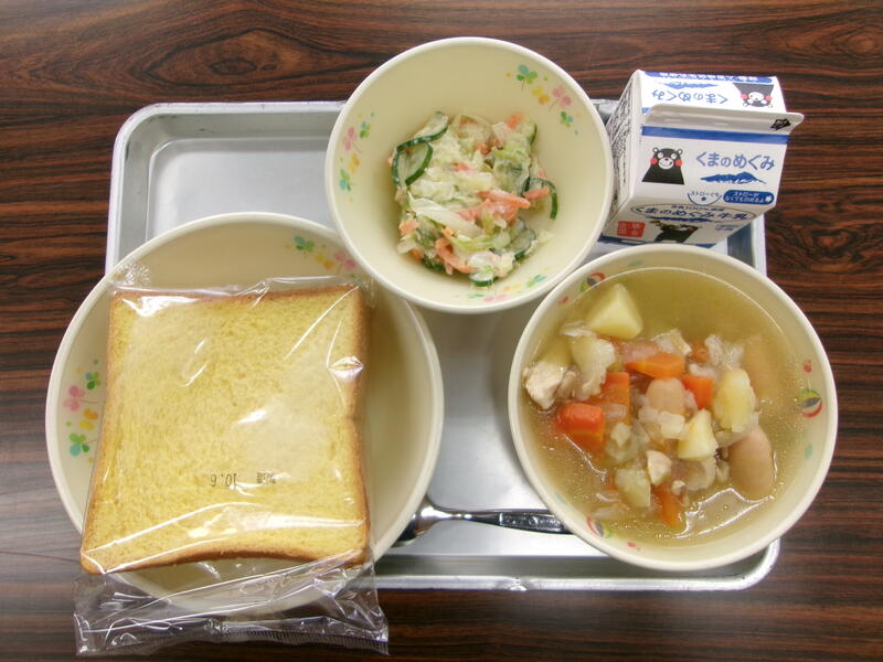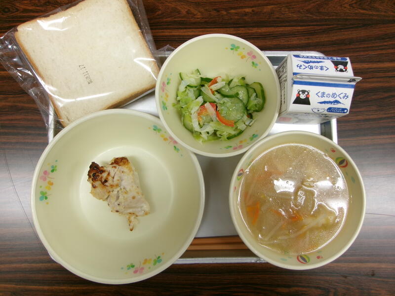 今日の献立は、食パン、鶏肉のマスタード焼き、トマト団子のスープ、フレンチサラダ、牛乳でした。