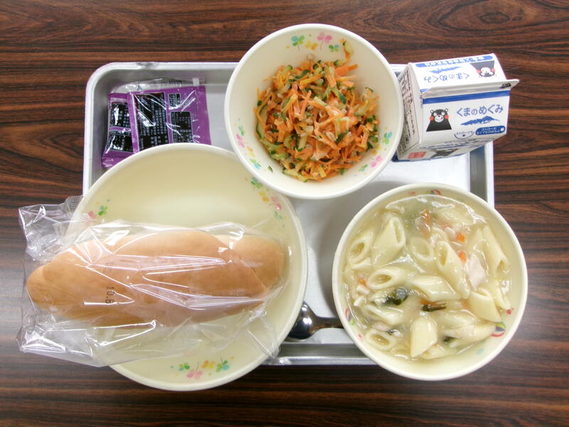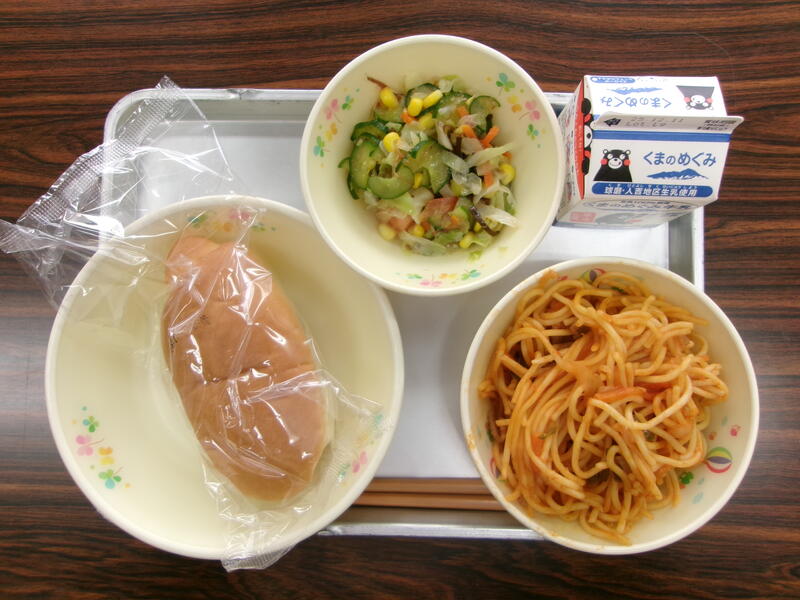 今日の献立は、コッペパン、げんきサラダ、くるくるスパゲッティ、牛乳でした。