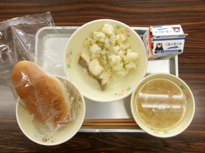 今日の献立は、ミルクパン、ホキのムニエル、粉ふきいも、野菜スープ、牛乳でした。
