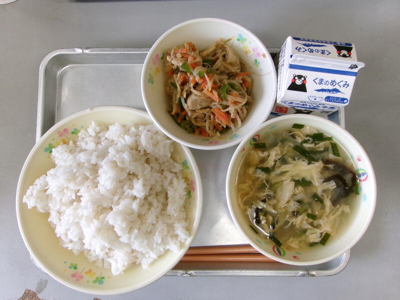 今日の献立は、麦ごはん、チンジャオロースー、にら玉スープ、牛乳でした。