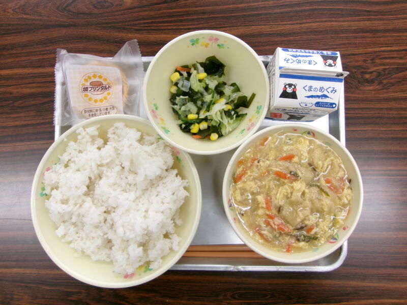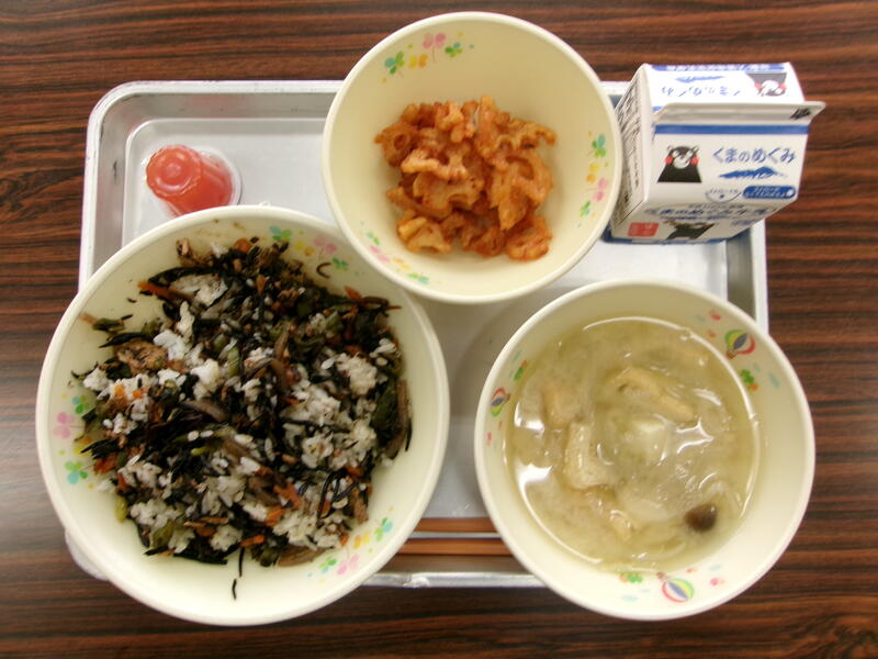 今日の献立は、セルフひじきごはん、れんこんのキムチ揚げ、豆腐のみそ汁、熊本県産トマトゼリー、牛乳でした。