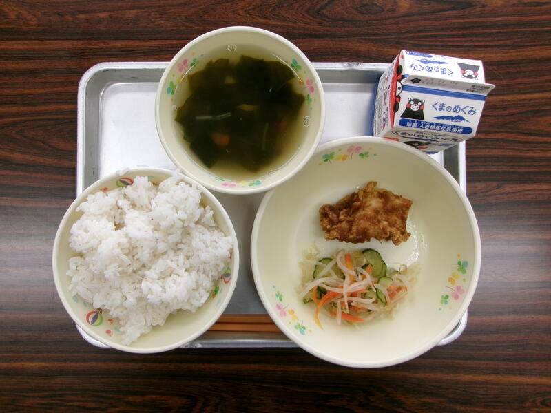 今日の献立は、麦ごはん、ユーリンチー、野菜のナムル、わかめスープ、牛乳でした。