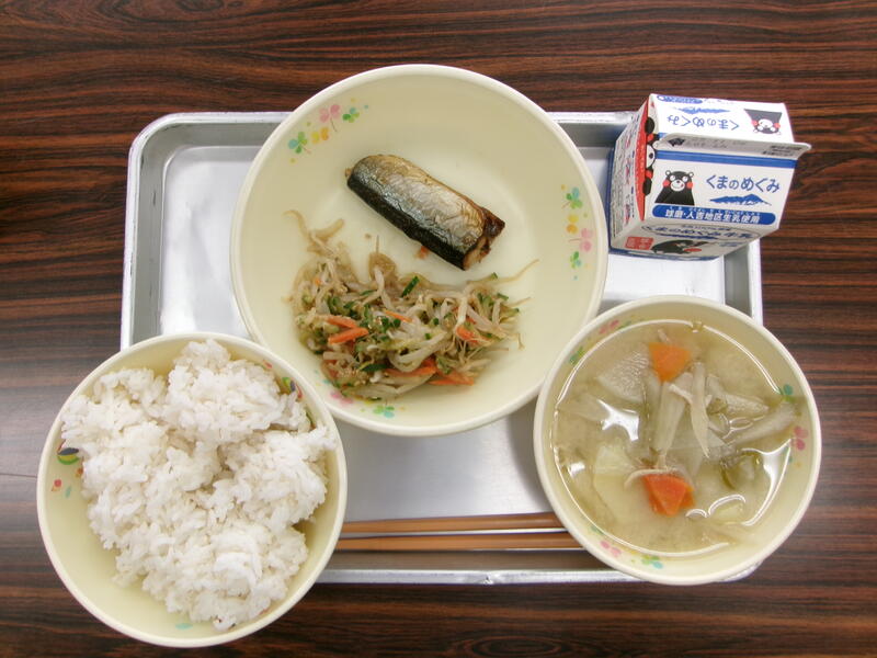今日の献立は、麦ごはん、サンマの塩焼き、ごまあえ、鶏汁、牛乳でした。