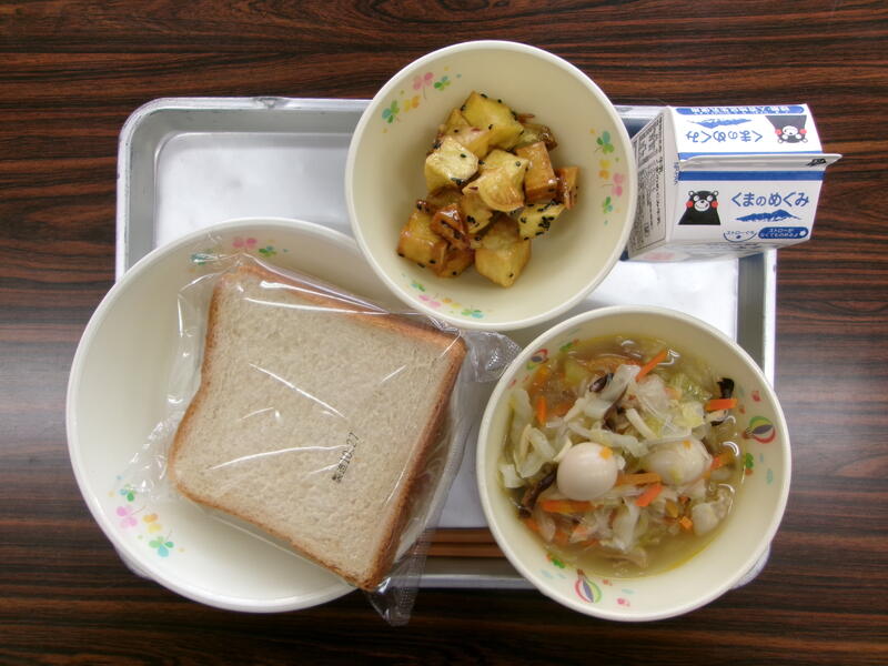 今日の献立は、黒糖パン、タイピーエン、大学芋、牛乳でした。