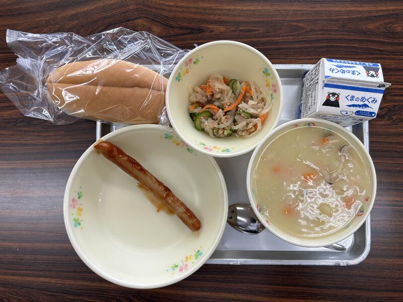 今日の献立は、コッペパン、マーマレードチキン、オニオンスープ、牛乳でした。