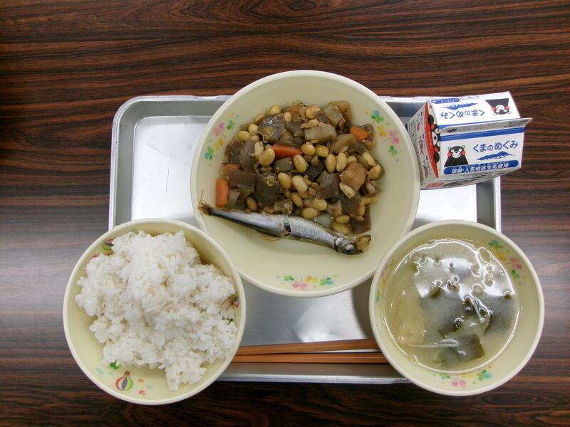 今日の献立は、麦ごはん、みそ汁、焼きししゃも、五目煮、牛乳でした。