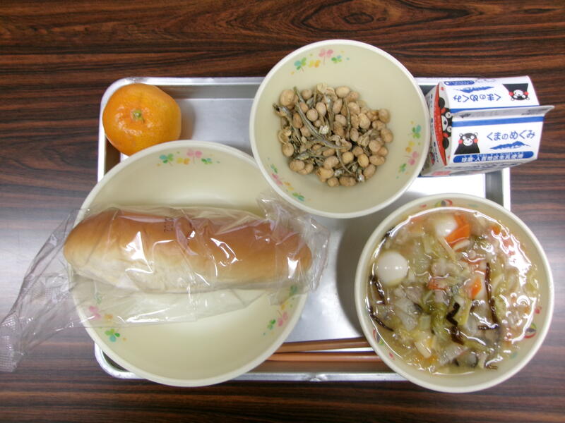 今日の献立は、ミルクパン、八宝菜、いりこと大豆のかりんとう、くだもの、牛乳でした。