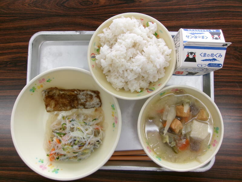 今日の献立は、麦ごはん、豚汁、太刀魚の生姜だれ、きくらげの酢の物、牛乳でした。