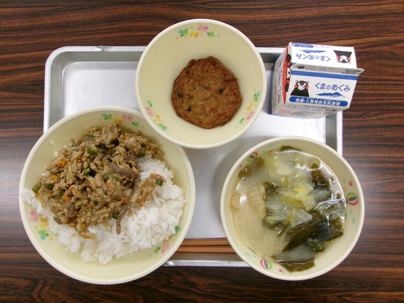今日の献立は、セルフれんこんそぼろごはん 、さといもの白みそ汁 、ぎょぎょ天ぷら、牛乳でした。