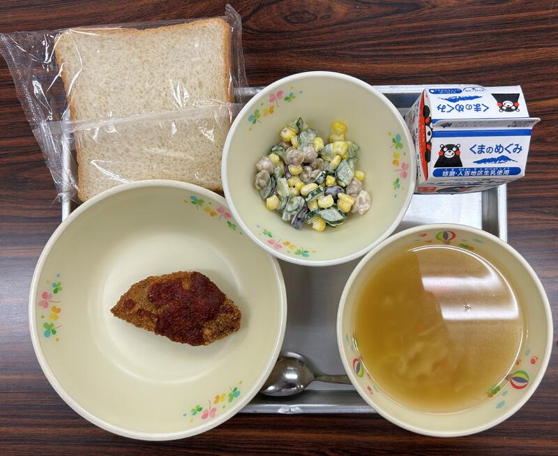 今日の献立は、食パン、コーンサラダ、トマトポークシチュー、牛乳でした。