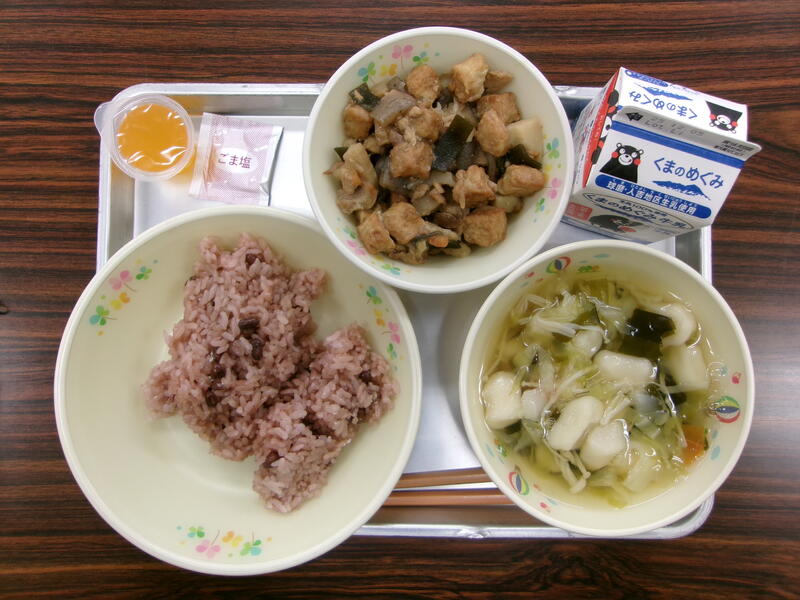 今日の献立は、赤飯、ごま塩、はんぺんのすまし汁、煮しめ、高田みかんゼリー、牛乳でした。