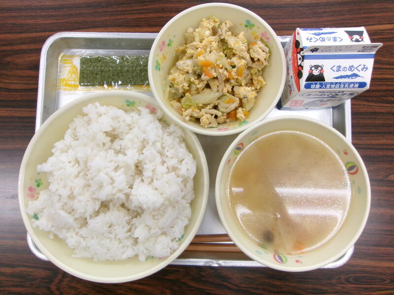 今日の献立は、麦ごはん、一食焼きのり、高野豆腐の卵とじ、いちょう葉汁、牛乳でした。