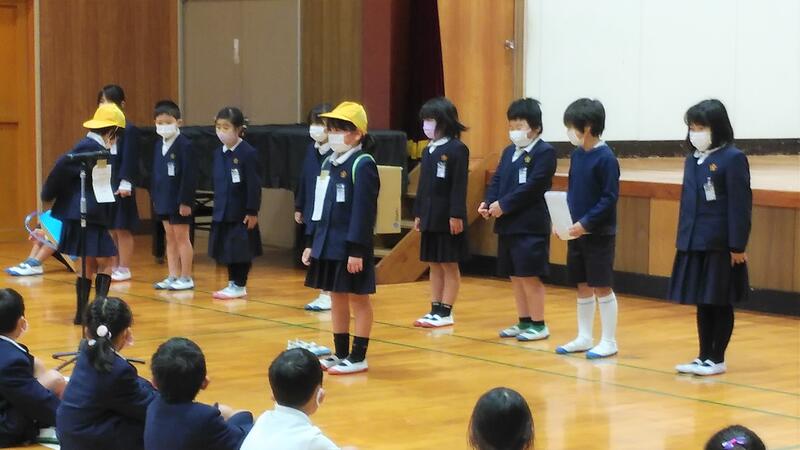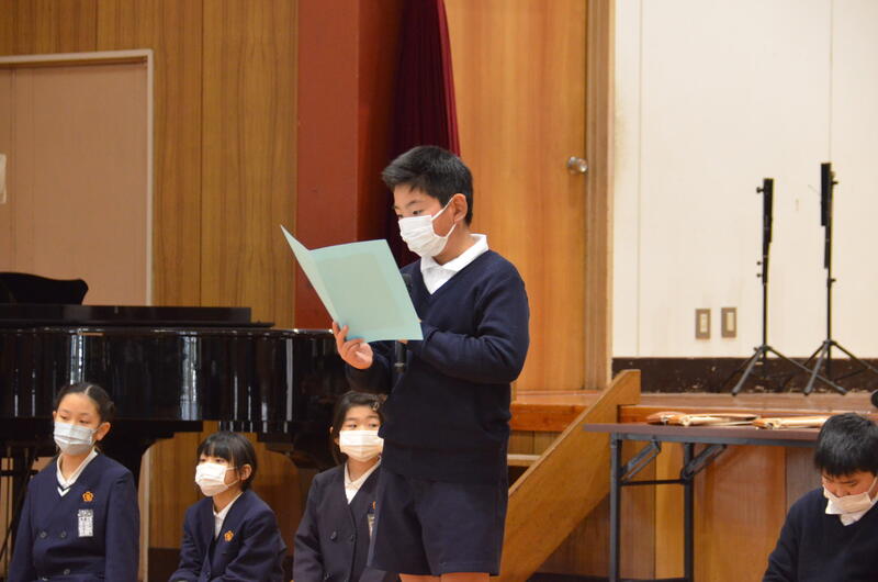 式では、まず、1年・3年・5年の代表児童が、2学期の振り返りや3学期の目標などについて話しました。とても立派な態度での発表でした。