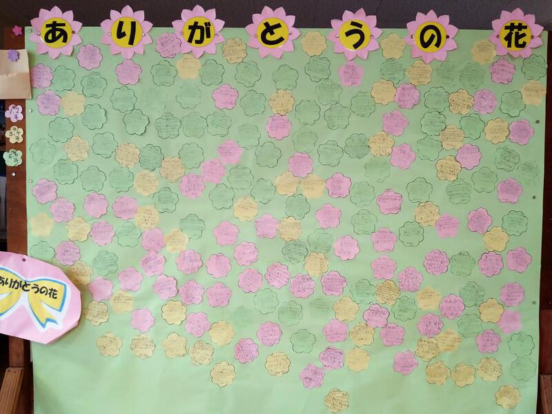 これは、友達に親切にしてもらったり、嬉しかったりしたことなどを、花の形のカードにその内容を記入して、廊下に設置されたボードに貼っていくという取組です。