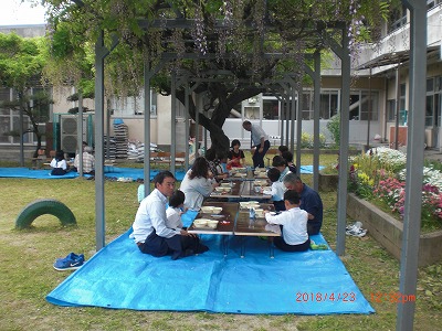 1年生の藤棚給食 投稿日時 : 2018/04/23 学校サイト管理者 今日は1年生の子どもたちとの藤棚給食を開きました。1年生の子どもたちは、初めての藤棚給食でした。藤棚の下でぱくぱくと楽しそうに給食を食べていました。 {{options.likeCount}} {{options.likeCount}}