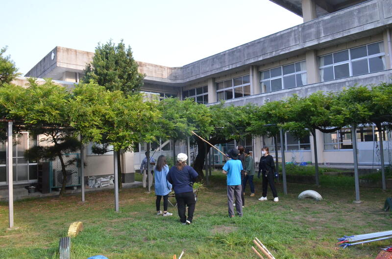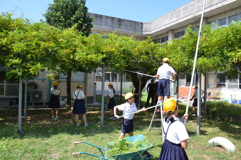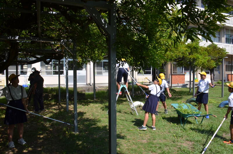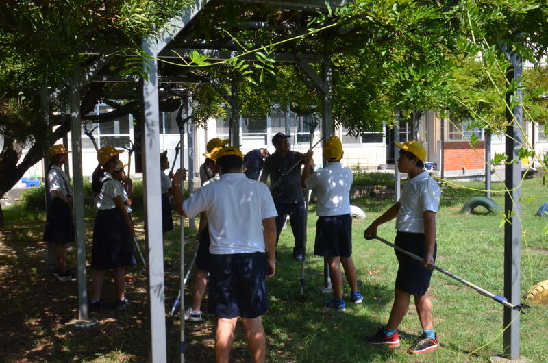 9月8日 藤棚の剪定をしました。今回は前回ほど芽が伸びておりませんでした。その分、切る場所に注意を払いながらの剪定でした。9月の朝とはいえ、まだまだ暑い中の作業になりました。PTA役員の皆様のご協力に感謝します。