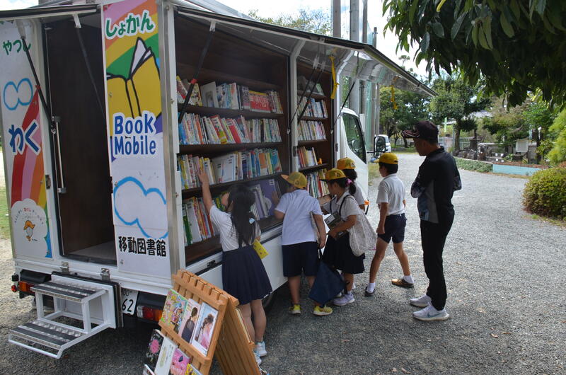 9月11日 八代市移動図書館わくわく号が昼休みにやって来ました。子供たちの中には、わくわく号が来るのを待ち浴びていた子もいて、本選びを楽しむことができました。わくわく号の本は、一度に10冊借りることができるので、子供たちには魅力が大きいようです。もっとたくさんお児童に利用してほしいと思っています。司書の先生が興味に合わせていろいろな本をすぐに紹介していただけるのも移動図書館のよさですから、わくわく号が来たら、みんなで行って借りましょう。