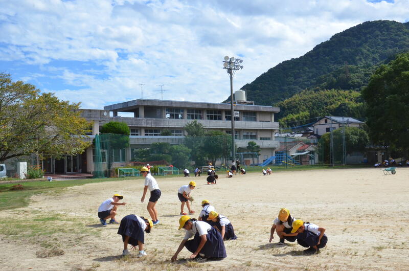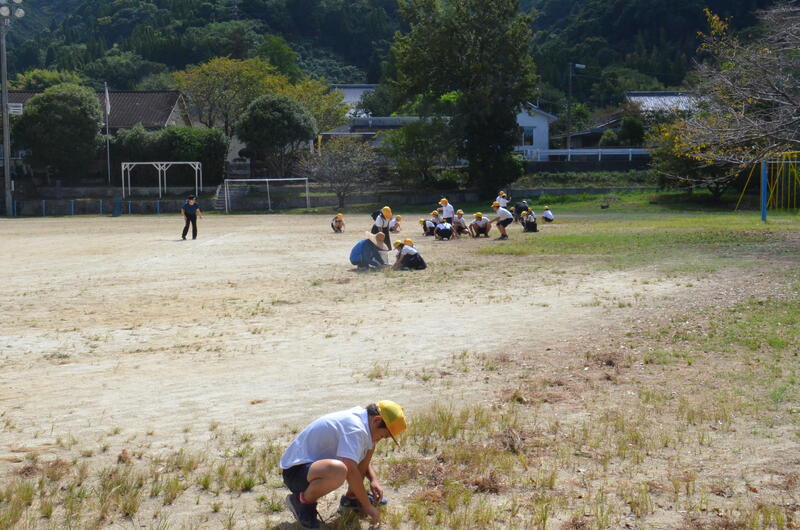 9月19日 業間に児童会運営人権委員会がクリーンタイムを呼びかけ、運動場の草引きをしました。運動場はまだ夏の暑さが残っていますが、子供たちは委員会のアナウンスをよく聞き、短時間にたくさんの草を引こうとしていました。運動会に向けて、少しずつ運動場の整備をしようと、子供たちが主体的に草引きをしようとしていたことが嬉しいです。