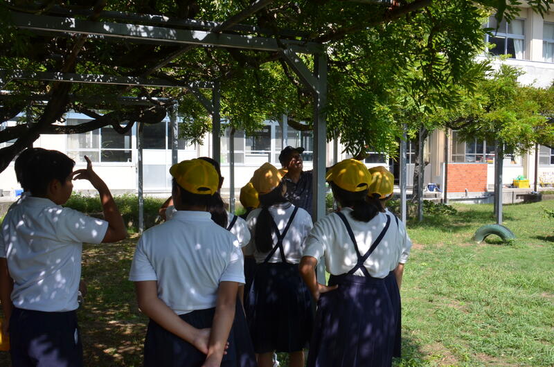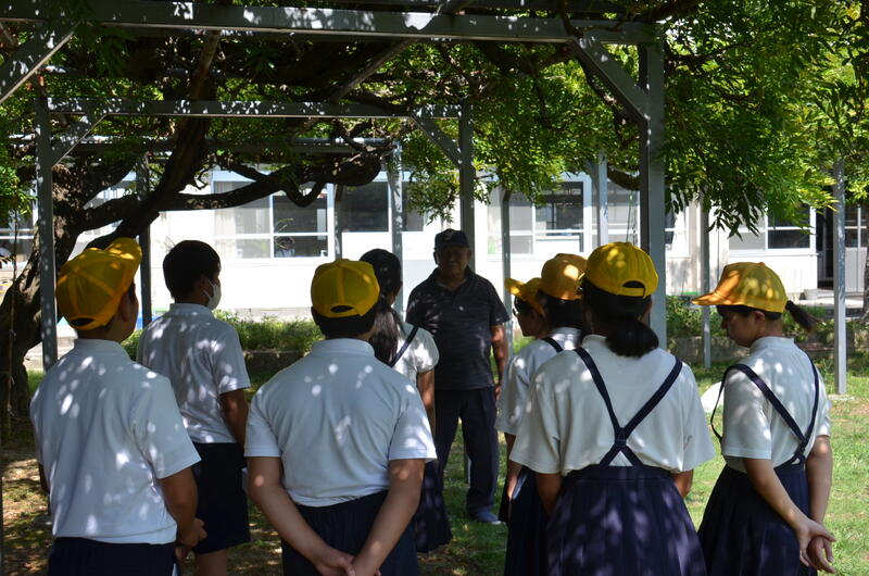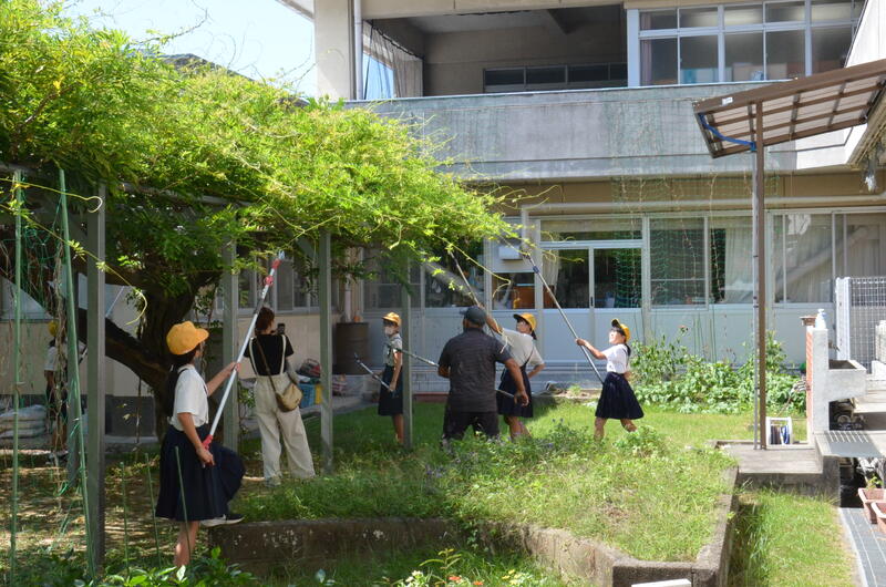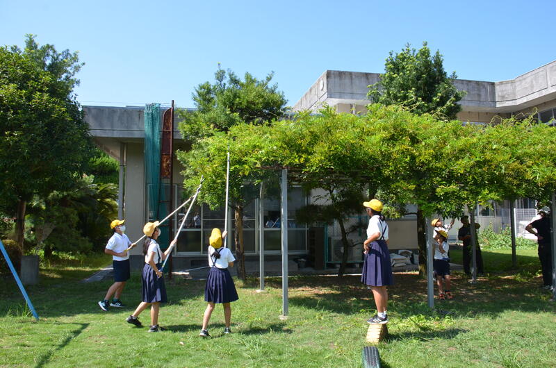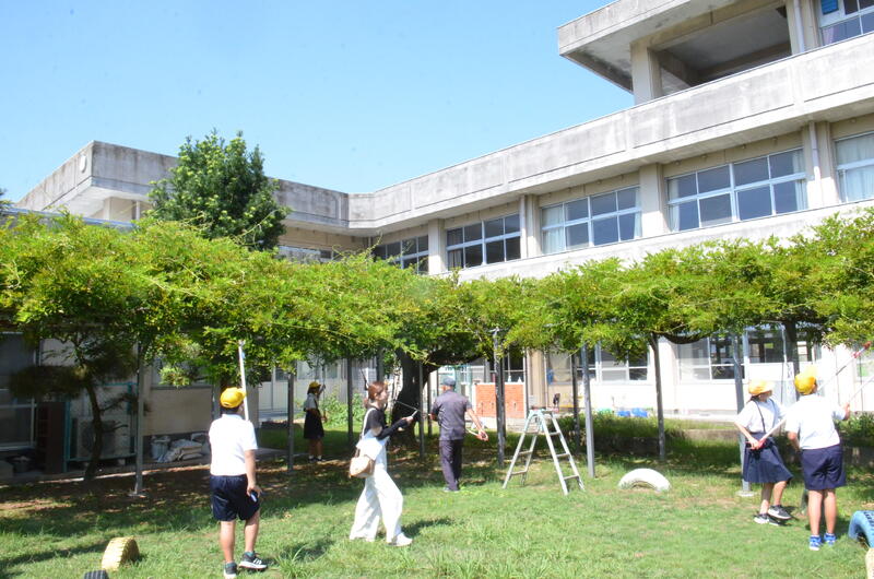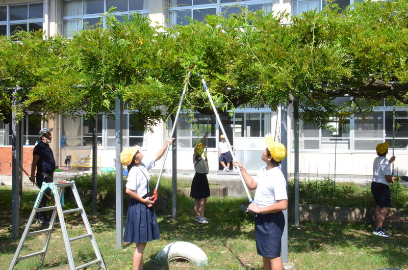 9月26日 6年生が、川上さんの指導を受けながら、藤棚の剪定をしました。5年生のときから、藤棚の管理をしてきているので、剪定も要領を得て上手にすることができました。