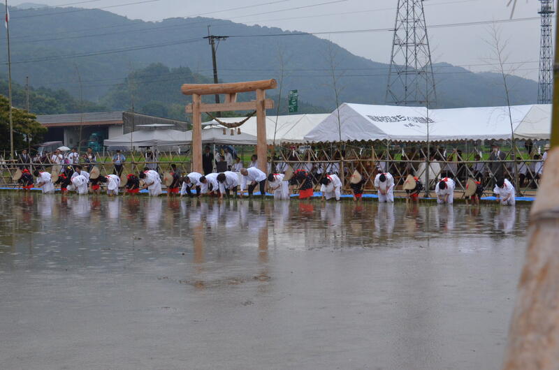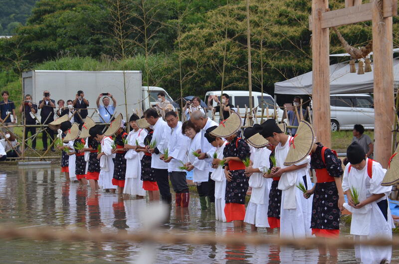 御田植祭は、農作業の工程を模擬的に演じ、豊作を祈念する行為だそうですが、文化的・伝統的な行事を継承したり、稲作の伝承をしたりする意味もあるそうです。