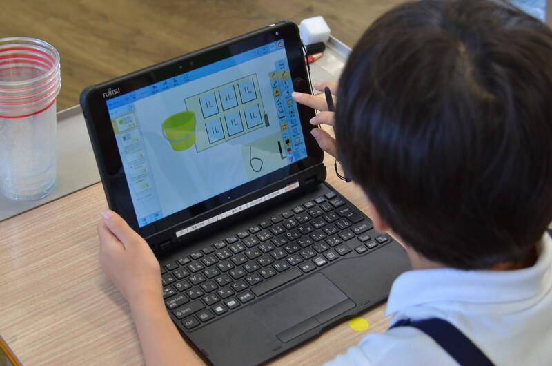 子供たちは、水のかさを比べたり、計ったりする単位「L」について、実際に水のかさを計りながら学ぶことができていました。