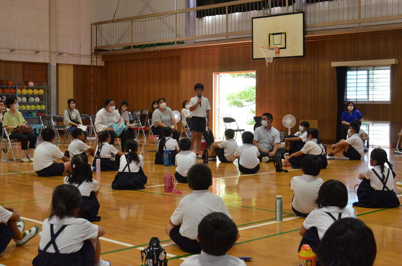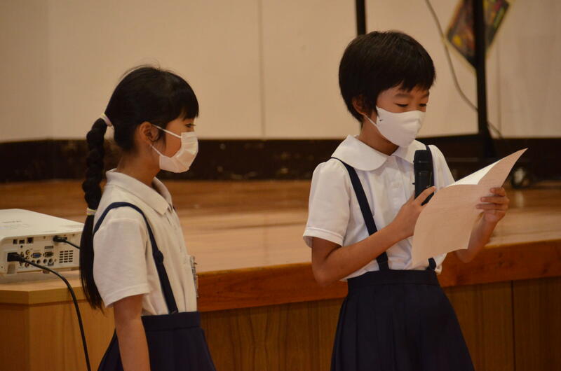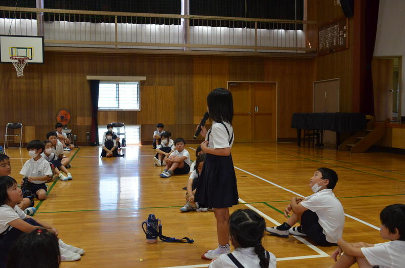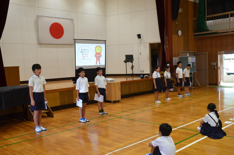 7月18日の朝、児童集会を開きました。この日の児童集会は放送・環境委員会と運営・人権委員会の取組についての発表でした。