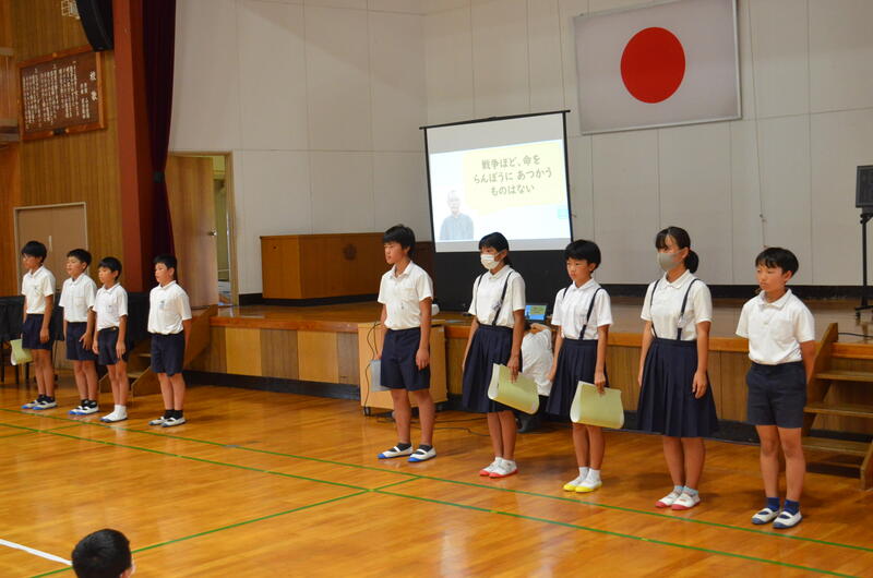 最後に、平和への願いを込めて「青い空は」(小森香子作詞・大西進作曲)を全校児童で合唱しました。